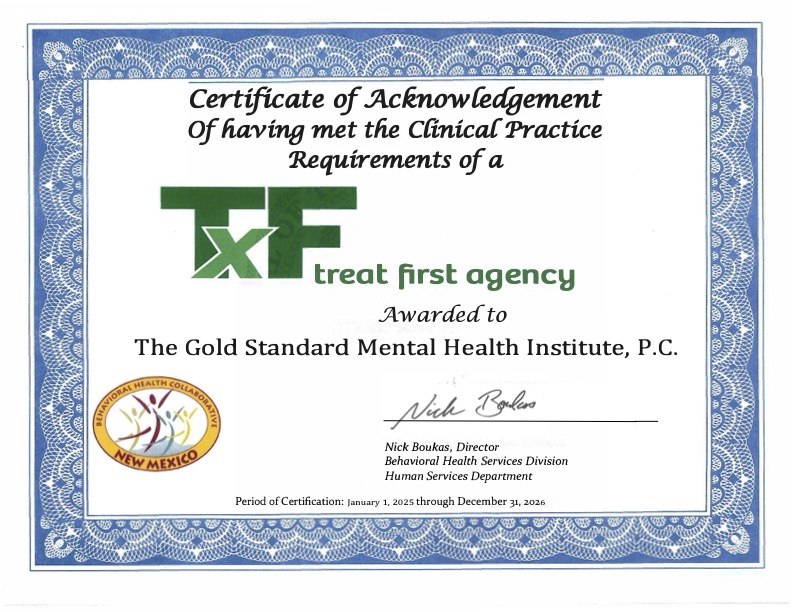 At The Gold Standard Mental Health Institute, we care about your experience securing the care that you need and deserve. We are proud to be a Treat First agency, which allows us to meet every person right where they are at, from your first visit. You can learn more at https://nmrecovery.org/treat-first